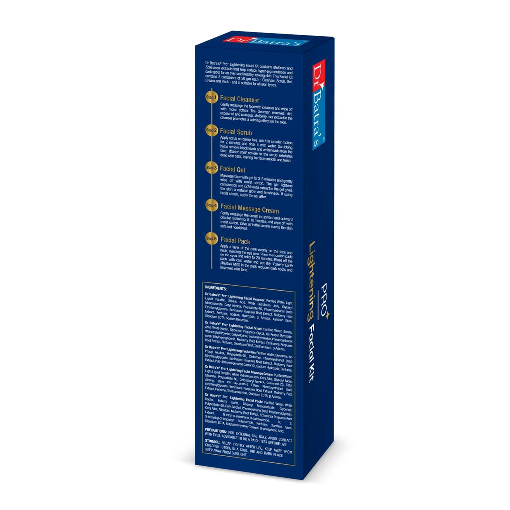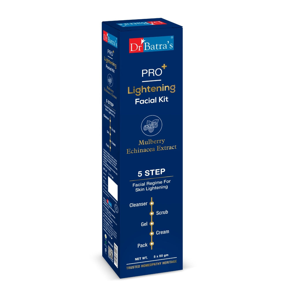 With more than 1 lakh happy patients and over 35 years of experience in treating hair and skin problems, Dr Batra’s extends the medical benefits of Homeopathy to consumers in their homes. Get the benefits of this natural and safe medical system with Dr Batra’s range of wellness products that have been developed by expert homeopathic dermatologists and trichologists who specialize in treating hair and skin problems from the root. The products are specially created for different hair and skin types and do not cause any side-effects. Dr Batra’s range of skin care products are carefully formulated with natural ingredients that protect and enhance overall skin health. To provide complete care, Dr Batra’s Pro+ Lightening Facial Kit includes a facial cleanser, facial scrub, facial gel, facial massage cream and face pack. This 5-in-1 lightening facial kit gives you the benefits of a salon-like experience in the comfort of your home. It helps reduce hyperpigmentation while gently improving overall skin tone. Free from harsh chemicals, it is the perfect choice for naturally radiant-looking skin.